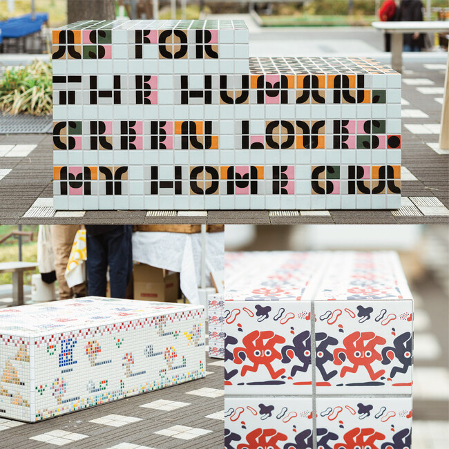 アーティストがデザインしたタイルのベンチなど、タイルをイメージして造られた作品を展示。