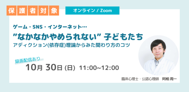 ゲームやスマホなど、お子さんの”なかなかやめられない”への関わり方について、保護者対象に、臨床心理士・公認心理師が専門的に解説します。10月30日(日)11:00~12:00のオンラインセミナー当日参加では質疑応答の時間もあります。当日都合が合わない場合には録画配信のみの申込みも可能です。
