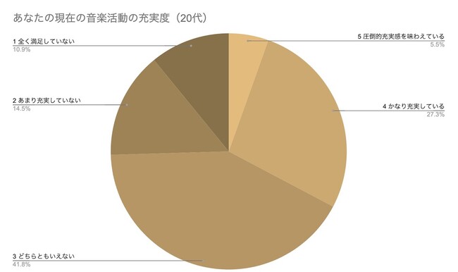 「現在のあなたの音楽活動の充実度」を5段階評価で自己評価する設問に対して、10代から70代まで全体の充実度をみると「5. 圧倒的充実感を味わえている」と「4. かなり充実している」を合わせた割合が5割弱であるのに対して、10代に絞ったグラフは全体とほぼ同じ5割弱ですが、20代になると3割強に減少しています。また「3. どちらともいえない」と回答している人の割合が4割を超えてきます。