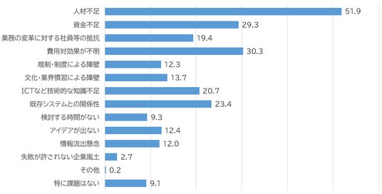 図:『DXの取組を進めるにあたっての課題』(出典:総務省「デジタル・トランスフォーメーションによる経済へのインパクトに関する調査研究」のデータを加工)
