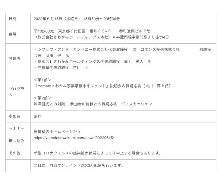 次回、6月15日(水)開催の「支援者の会」には、ゲストスピーカーにシブサワ・アンド・カンパニー株式会社代表取締役 兼コモンズ投信株式会社取締役会長で、渋沢栄一の玄孫の渋澤健氏をお迎えし、長期投資の草分け的存在である株式会社さわかみ投信創業者であり当機構の相談役である澤上篤人、当機構代表の吉川明の3名でのパネルディスカッションを行います。「新しい資本主義と事業承継」をテーマに、営利目的の資本主義では解決できない社会問題を長期投資やSDGs、インパクト投資でいかに解決するか、我々にできることは何か等についてディスカッションします。