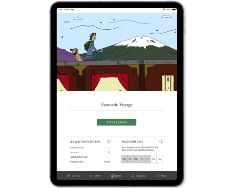 Gymglishのレッスンは、コミカルなショートストーリーの連載形式で進んでいきます。楽しめるコンテンツで語学学習に取り組むと、記憶に定着し易いという脳科学の知見に基づいています。Gymglishは上記のように、続けやすい事、成果を出せる事を目標に設計されており、これまで受講者の出席率80%といった実績をあげています。