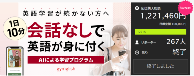 Gymglishを、アタラシイものや体験の応援購入サービス「Makuake」にて7月26日にリリースし、9月27日までに、267名のサポーターに応援購入いただき、応援購入目標金額の1221%を達成いたしました。