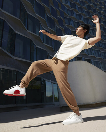 地球環境やアニマルライツを守る新たな価値ある素材として注目を集めるヴィーガンレザー、バイオベース素材を使用したソール、再生ポリエステル100%の靴ひもを採用した「アドロン ジュニア」は、クリスチャン ルブタンの定番スニーカーシリーズ「ルイ」のアイコニックなシルエットをそのままにレッドソールをアップデート。内側のアーチから側面にほどこされたルビレッドのディテールが印象的なデザインが、一味違ったスポーティなスタイルへと昇華させています。