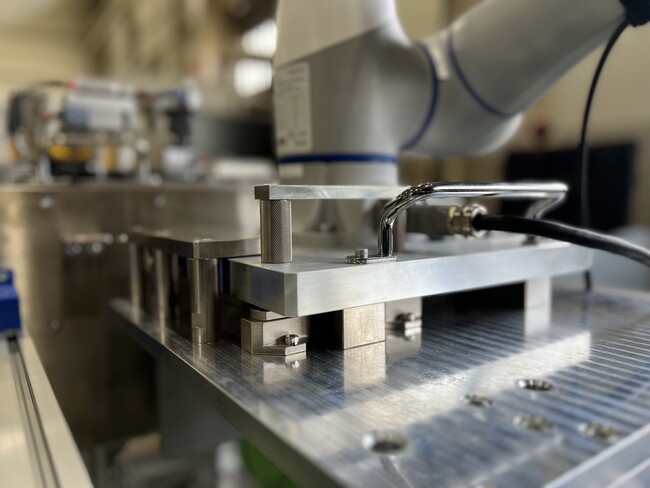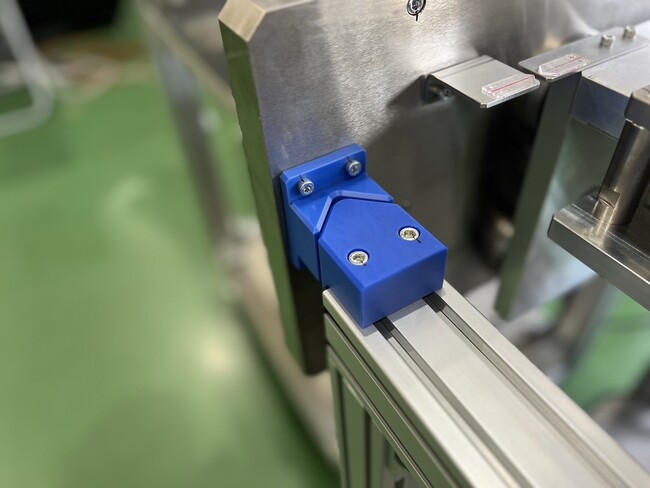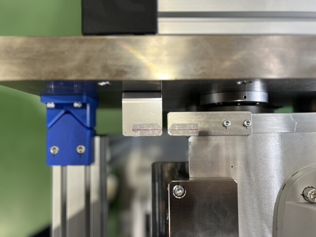 協働ロボット積載の台車は重く、ターゲットの位置に合わせづらかったので、位置だし用Vブロックを設定。このことにより、ならいながらターゲットの位置に接続することが出来ます。