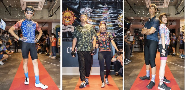 「あなたが主役になるサイクルウェア」をテーマに掲げた今回の出展では、着る人が自然に笑顔になり、自慢したくなるCYCOLOGYのアートを顧客らが自らモデルとなってショーを行うことで、着る事の楽しさを来場者に見せつけるのが目的だ。
