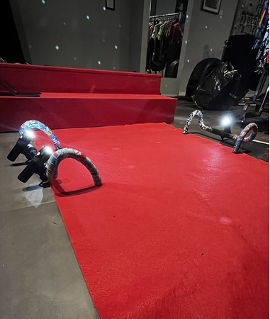 今回のショーではライトをCYCOLOGYの人気商品であるバーテープを巻いたハンドルバーに取り付け設置する。 ライトの明るさだけでなく、商品のサイズ感を観客へ伝えることも目的としているからだ。