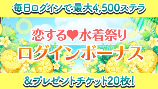 期間中ログインで最大4,500ステラ&プレゼントチケット20枚が貰える、特別ログインボーナスを開催しております。毎日忘れずにログインしてステラ&プレチケをお受け取りください。