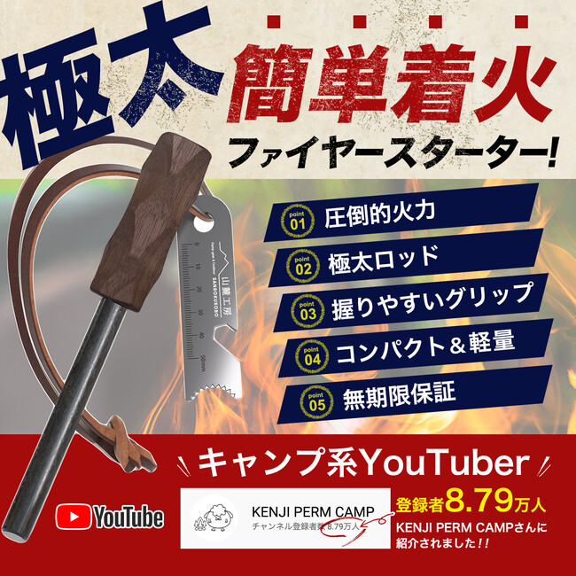 ~圧倒的火力で簡単着火!ストローク部分が長くしっかり擦れるため、軽い力で大量の火花を出すことが可能な一品です。キャンプ系YouTuber「KENJI PERM CAMP」(チャンネル登録者数:87,900人)さんに紹介されました!~