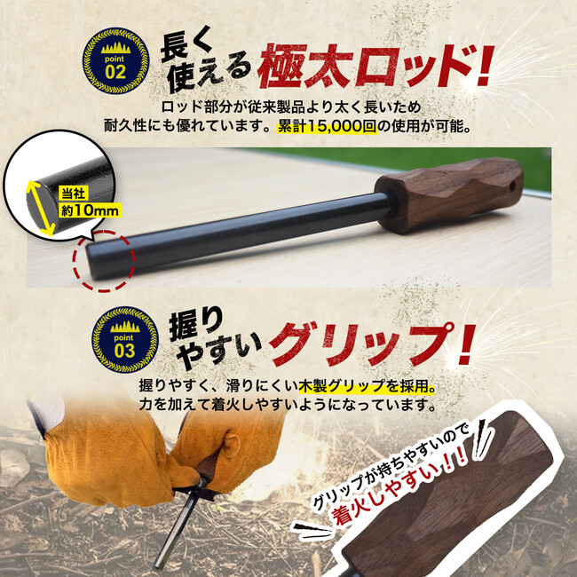 「極太ファイヤースターター」は、ロッド部分を太めにすることで「15,000回」の摩擦回数に対応。長期間の使用も可能です。
