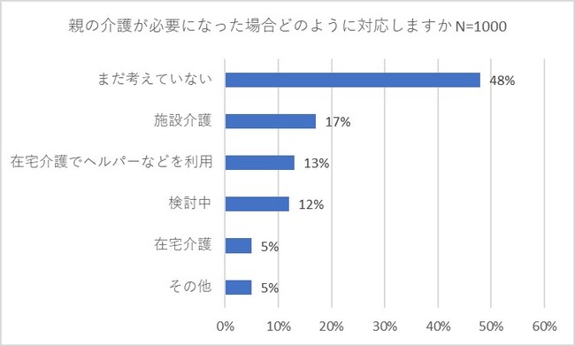 また、実際に親の介護が必要な状態になった場合の対応について質問したところ、「まだ考えていない」との回答が圧倒的に多く48パーセントで最多となりました。以下は「施設介護」(17パーセント、)「在宅介護でヘルパーなどを利用」(13パーセント)、「検討中」(12パーセント)が続きました。