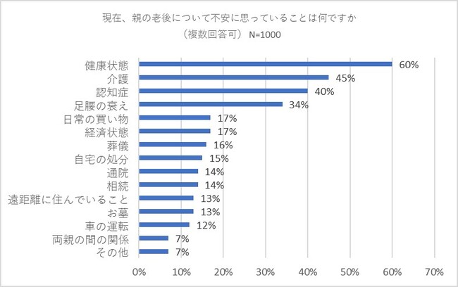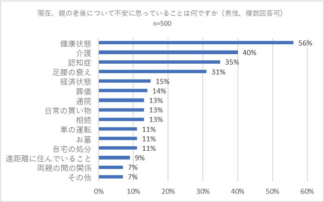 次に「現在、親の老後について不安に思っていることは何ですか」と複数回答可で質問したところ、「健康状態」が60パーセントで最多となりました。以下、「介護」(45パーセント)、「認知症」(40パーセント)、「足腰の衰え」(34パーセント)が続き、健康に関わる不安が多い結果になりました。男女別でも上位の4つは変わりませんでしたが、「介護」については男性40パーセント、女性51パーセントと女性が10パーセント以上多い結果になりました。「認知症」についても女性が男性よりも約10パーセント多い結果となりました。介護になると日本では女性に負担がかかりやすい面があるため、親の健康面について女性がより敏感になっているのかもしれません。