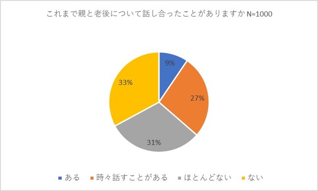 まず初めに「これまで親と老後について話し合ったことがありますか」と質問したところ、「ない」との回答が33パーセントでトップとなりました。僅差で「ほとんどない」(31パーセント)が続き、「時々話すことがある」が27パーセント、「ある」が9パーセントとなりました。「ある」と「時々話すことがある」の合計は36パーセントで、「ほとんどない」と「ない」の合計64パーセントを大きく下回る結果となり、老後に関して親としっかりコミュニケーションが取れていないことがわかりました。