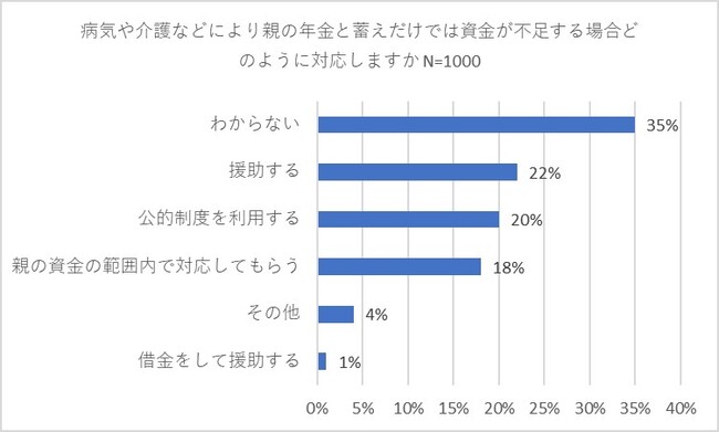 病気や介護などにより親の年金と蓄えだけでは資金が不足する状況が発生した場合の対応についても尋ねました。「わからない」が35パーセントで最多となりました。以下、「援助する」(22パーセント)、生活保護や高額医療・高額介護合算療養費制度などの「公的制度を利用する」(20パーセント)、「親の資金の範囲内で対応してもらう」(18パーセント)が続きました。