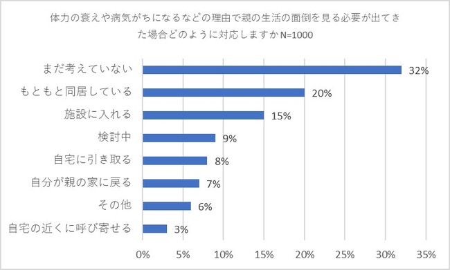 次に介護の必要はないものの、体力の衰えや病気がちになるなどの理由で親の生活の面倒を見る必要が出てきた場合の対応について尋ねました。最も多い回答は「まだ考えていない」(32パーセント)となり、以下「もともと同居している」(20パーセント)、「施設に入れる」(15パーセント)が続きました。「自宅に引き取る」(8パーセント)、「自分が親の家に戻る」(7パーセント)、「自宅の近くに呼び寄せる」(3パーセント)など、親の面倒を直接見る割合は少ない結果となりました。