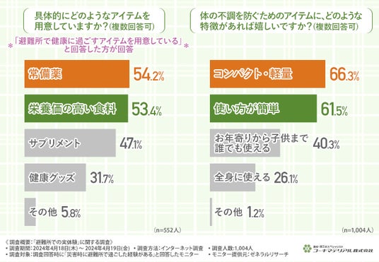 身体の不調を防ぐためのアイテムとして、持ち運びに便利で、簡単に使えるというニーズが高いことが示されることから、限られた空間でも使用でき、持ち運びに便利で誰でも使えるアイテムがあれば、避難所でも健康に過ごせる可能性が示唆されました。