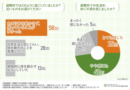 「避難所ではどのように過ごしていましたか?近いものをお選びください」と質問したところ、『あまり体を動かさず、座っていることが多かった(58.5%)』と回答した方が最も多い結果となりました。たくさんの方が避難する場所では、身体を動かすスペースもほとんどない場合が多いのではないでしょうか。「避難所での生活中、体に不調を感じましたか?」と質問したところ、『とても感じた(25.1%)『やや感じた(47.8%)』『あまり感じなかった(21.2%)』『まったく感じなかった(5.9%)』という回答結果になりました。