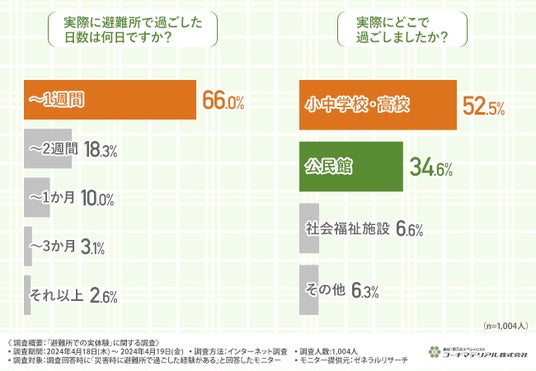 はじめに、「実際に避難所で過ごした日数は何日ですか?」と質問したところ、『~1週間(66.0%)』と回答した方が最も多い結果になりました。続いて、「実際にどこで過ごしましたか?」と質問したところ、『小中学校・高校(52.5%)』と回答した方が最も多く、次いで『公民館(34.6%)』と続きました。災害に遭遇した際は、小中学校・高校、公民館のような場所で1週間程度過ごすことになる傾向にあるようです。