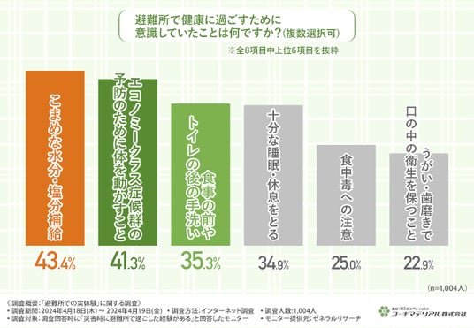 避難所で健康に過ごすために意識していたことTOP3は「水分・塩分補給」「エコノミークラス症候群予防」「手洗い」