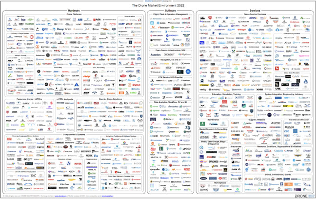 Drone Industrial Insightsが毎年発表するこのマップは、このアドバンスドエアモビリティ産業の様々な分野で活躍する企業を掲載しており、その多様性が伺えます。