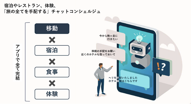 今後は、ヘリ以外の移動手段を追加、また宿泊やレストラン、アクティビティに関する予約もAIチャットを用いて一括で管理し、旅のコンシェルジュを全てアプリで完結する総合プラットフォームの確立を目指していく。