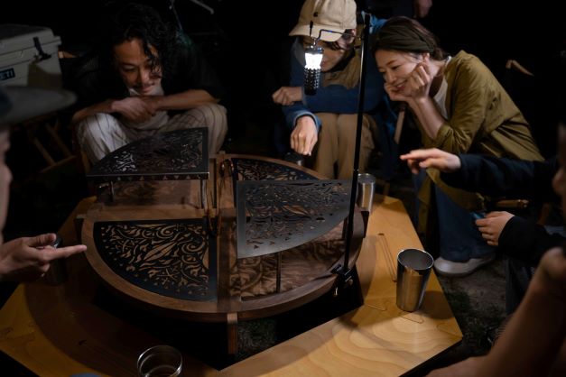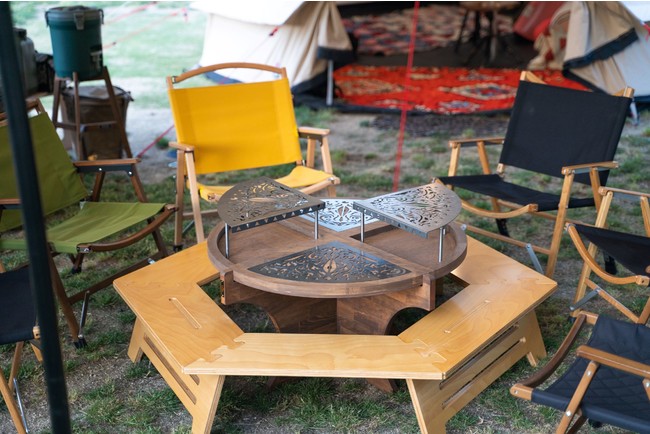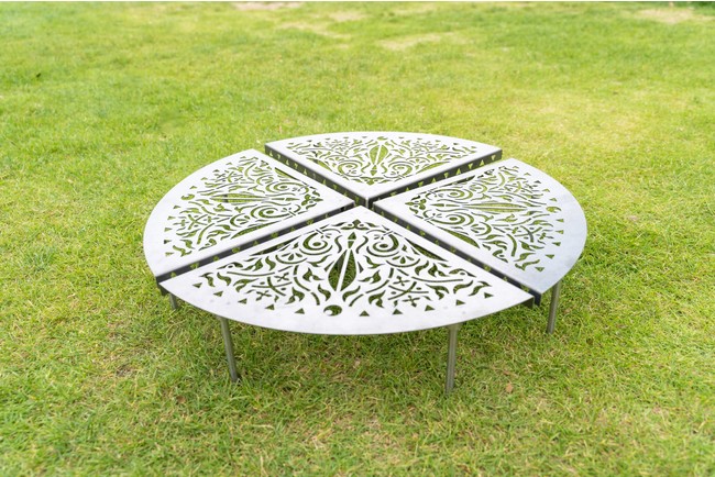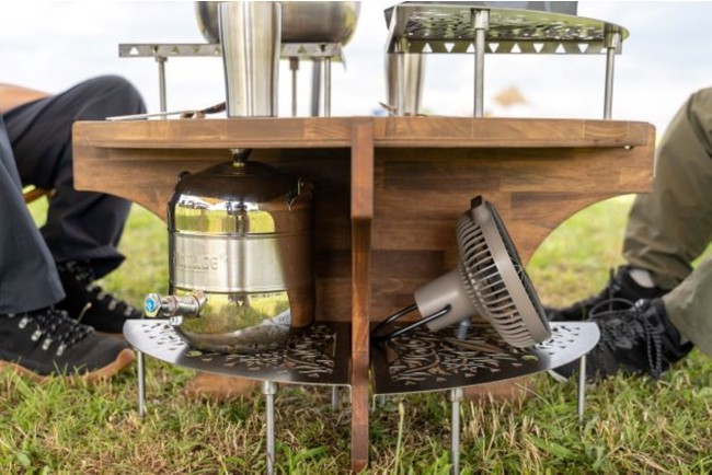 「Arabesque Stand」は焚き火やストーブ周りで使用すると調理した鍋やフライパンなどを直接置けて非常に便利で多機能なテーブルになります。グループキャンプのみならずソロキャンプでも火周りで使えばちょうどいい大きさと高さで様々なグループサイズでご利用いただけます。オプションを購入し4つのテーブルを組み合わせると小さな丸テーブルになり無骨でありながらデザイン性の高いシルエットで男性・女性共にお楽しみいただけます。