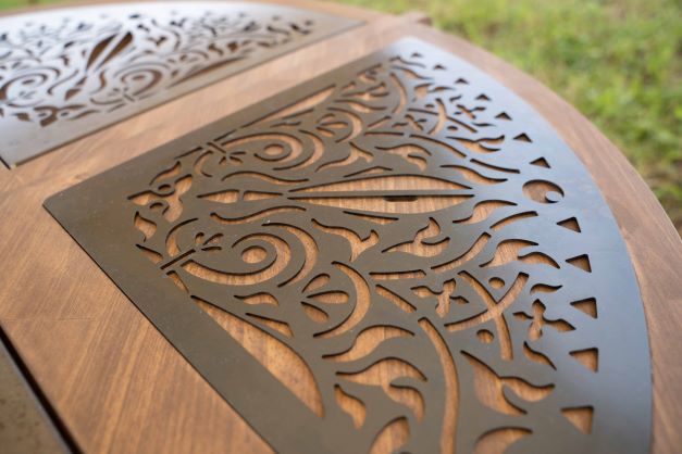 円形テーブルの天板面は4か所にアイアンプレートが埋め込まれており、お鍋やフライパンなどをのせても木に触れていない為、木が直接焼ける心配はございません。更に、4つのプレートの内2つは3本の脚を取り付ければアイアンミニテーブル(アラベスク・スタンド「Arabesque Stand」)に早変わり。10インチの大型ダッチオーブン
