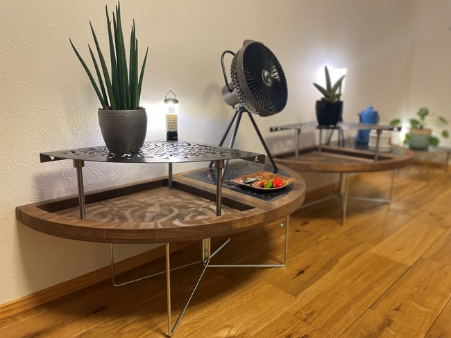 工夫次第で、テーブルのみならずデザイン性の高い棚としてもご利用いただけます。天板を2つに分けて他商品などのスタンド(本商品の付属はございません)を配置すれば、他には無いハーフムーン形状で高級感のあるお洒落な棚としてもご使用いただけます。サイト内のみならずテント内や家の中で設置いただいても幅の広い空間演出が可能です。