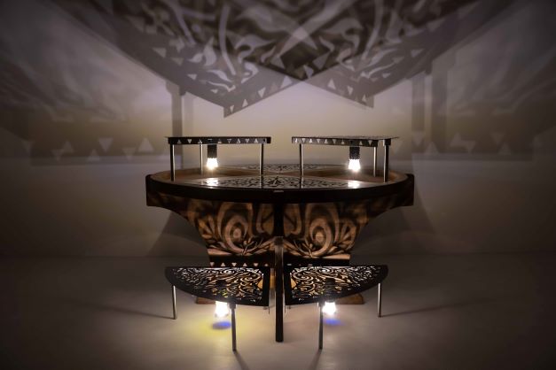 更に夜になると隠された演出がお楽しみいただけます!天板面はより華やかでゴージャスに変化します。天板上に照明をあてると、アイアンプレートに刻まれたアラベスク調の装飾デザインが天板面に影で映し出され遊び心をとことん擽り、思わず写真を撮ってしまう映えた演出が可能です。照明の角度を変えると様々な陰影をお楽しみいただけます。
