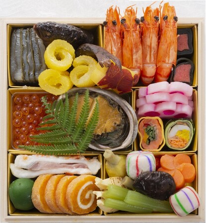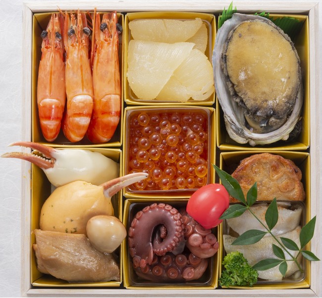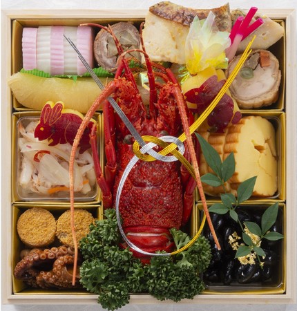 ロブスター、紅白小利休蒲鉾、数の子、牛牛蒡、目鯛西京焼き、はじかみ、栗きんとん、チキンロール、白えびのマリネ、鱈子真子旨煮、煮蛸、伊達巻、丹波黒豆金箔、干支丸十