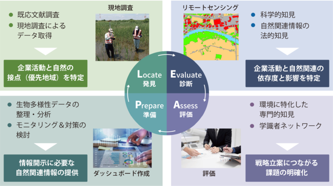 生物多様性情報開示支援サービスにおけるLEAPアプローチのイメージ