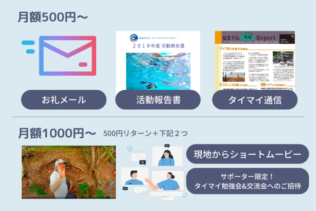 お礼メール、団体活動報告書、タイマイ通信、現地(インドネシア)からの活動の様子を届けるショートムービー、サポーター限定タイマイ勉強会&交流会へのご招待