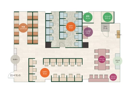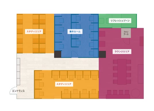 定番の仕切り付きスタディデスク、外界からの影響を軽減する「集中ルーム」、カフェ感覚のソファとデスクを融合させた「快適ソファデスク」、居心地よく作業ができる「ラウンジエリア」、さらに読書にぴったりな「くつろぎチェア」など多彩な選択肢をご用意しています。