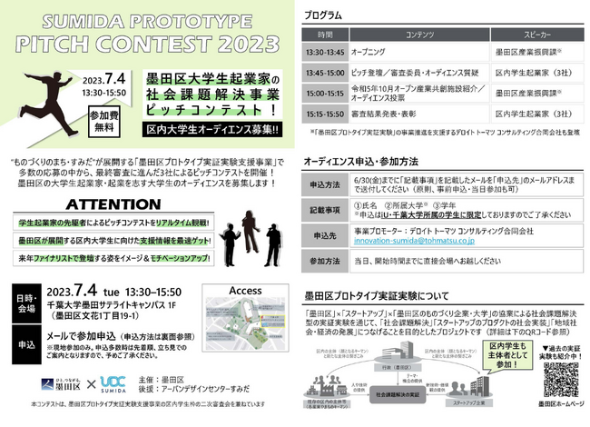 2023年7月4日(火)に墨田区プロトタイプ実証実験支援事業の最終審査に選ばれた3社のピッチコンテストを千葉大学墨田サテライトキャンパスにて開催します。開催にあたり、iU(情報経営イノベーション専門職大学)、千葉大学の学生を対象にピッチコンテストのオーディエンス(観覧者)を募集します。参加は無料です。