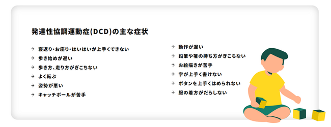 DCD症状は、年齢によって様々な特徴が現れます。乳児期は、母乳やミルクの飲みが悪い、寝がえりがうまくできない、はいはい・お座りがうまく出来ないという症状が発生、幼児期は、一人歩きが遅い、発音が不明瞭、食べこぼしが多い、寄りかからずに座るのが不安定など、学童期は、体育(球技、体操、走るなど)が苦手、ひもが結べない、文具や工具の使用が苦手などの症状があります。