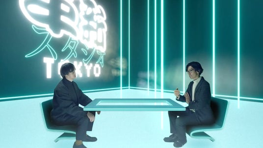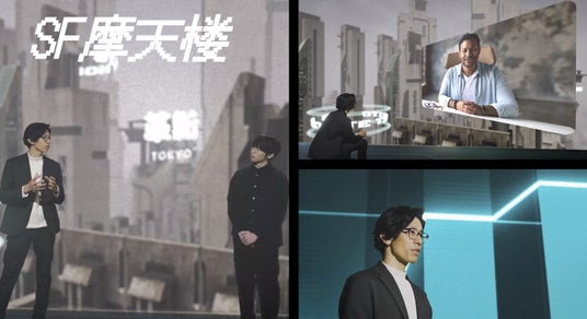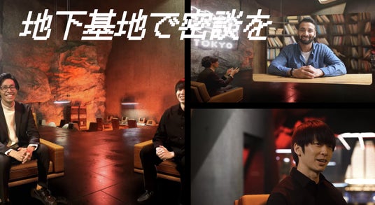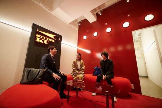 革新スタジオTOKYOの未来的空間で、「対談撮影」をしているイメージ