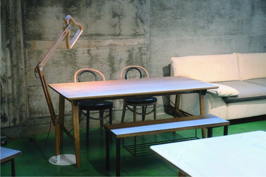クラッシュクラッシュプロジェクトのダイニングテーブルとベンチ。トトンで取り扱うダイニングチェア、照明と組み合わせた。