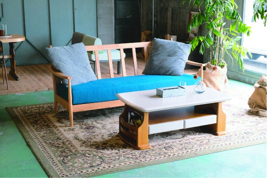 座面クッションを作り直したソファ、天板や引き出しに塗装を施したテーブル。