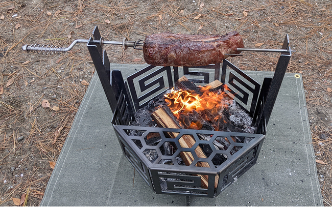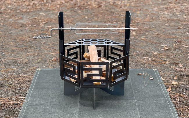 『狩猟型焚火台インフィニティ』は、頑丈な3.2mm厚の黒皮鉄板を使った組立式の焚火台で、キャンプ初心者でも簡単に組み立てることができます。支柱を焚火台本体にセットしてステンレス製の焼串を使用することにより、原始スタイルの豪快で楽しいキャンプ料理体験を提供いたします。また、クラウドファンディング発表時から生産工程とセット内容を見直し、本体、支柱、焼串、五徳、帆布袋の5点セットで88,000円(税込)と、より多くのお客様にご利用いただける価格に設定しました。『狩猟型焚火台インフィニティ』のワイルドで楽しい体験が、あなたのアウトドアライフをより一層豊かにしてくれます。