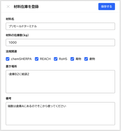 Sotasでは製品登録の際にSDS(安全性データシート)の添付をするだけで、毒劇物の情報を自動で取り込み、当該製品の取引を5年間自動保管、さらにはレポートを出すことも可能です。そのほかにも、REACHやRoHS、電子帳簿保存法、インボイス制度にも対応しています