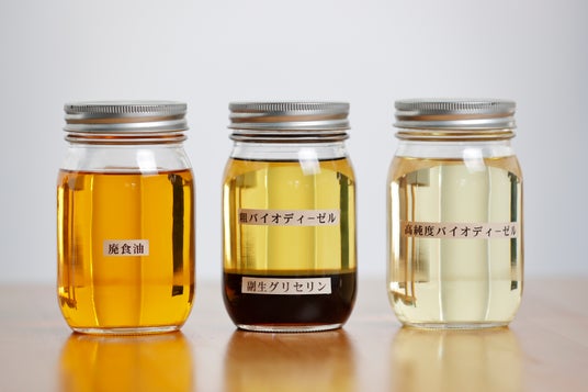 精製工程ごとのサンプル。一番右が高純度バイオディーゼル燃料