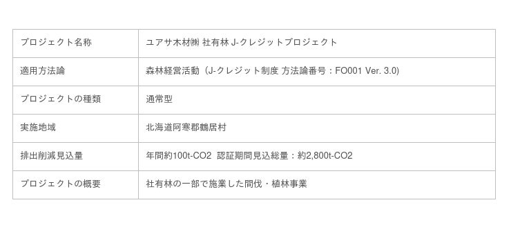 ユアサ木材株式会社(本社:東京都千代田区、代表取締役社長:福住 勉、以下「当社」)は、企業などが省エネルギー機器の導入や森林経営などの取組によるCO2などの温室効果ガスの排出削減量や吸収量を、国がクレジットとして認証する「J-クレジット制度」において、社有林の整備活動(間伐・植樹)によるCO2吸収量をクレジット化できる森林経営活動プロジェクトをJ-クレジット制度事務局に申請し、2023年3月15日付けでJ-クレジット制度認証委員会より認証を受けたことを、お知らせいたします。