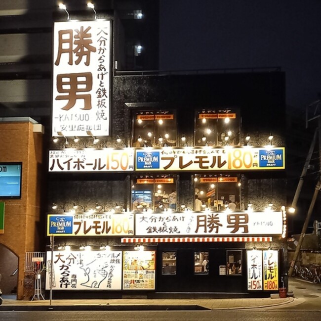 大阪で長年愛されてきた、プレモルが一杯180円と大分中津からあげが自慢の居酒屋です。2012年に一号店がオープンしてから約10年、勝男は大阪・東京を中心に全国40店舗以上、毎日頑張って営業しています。