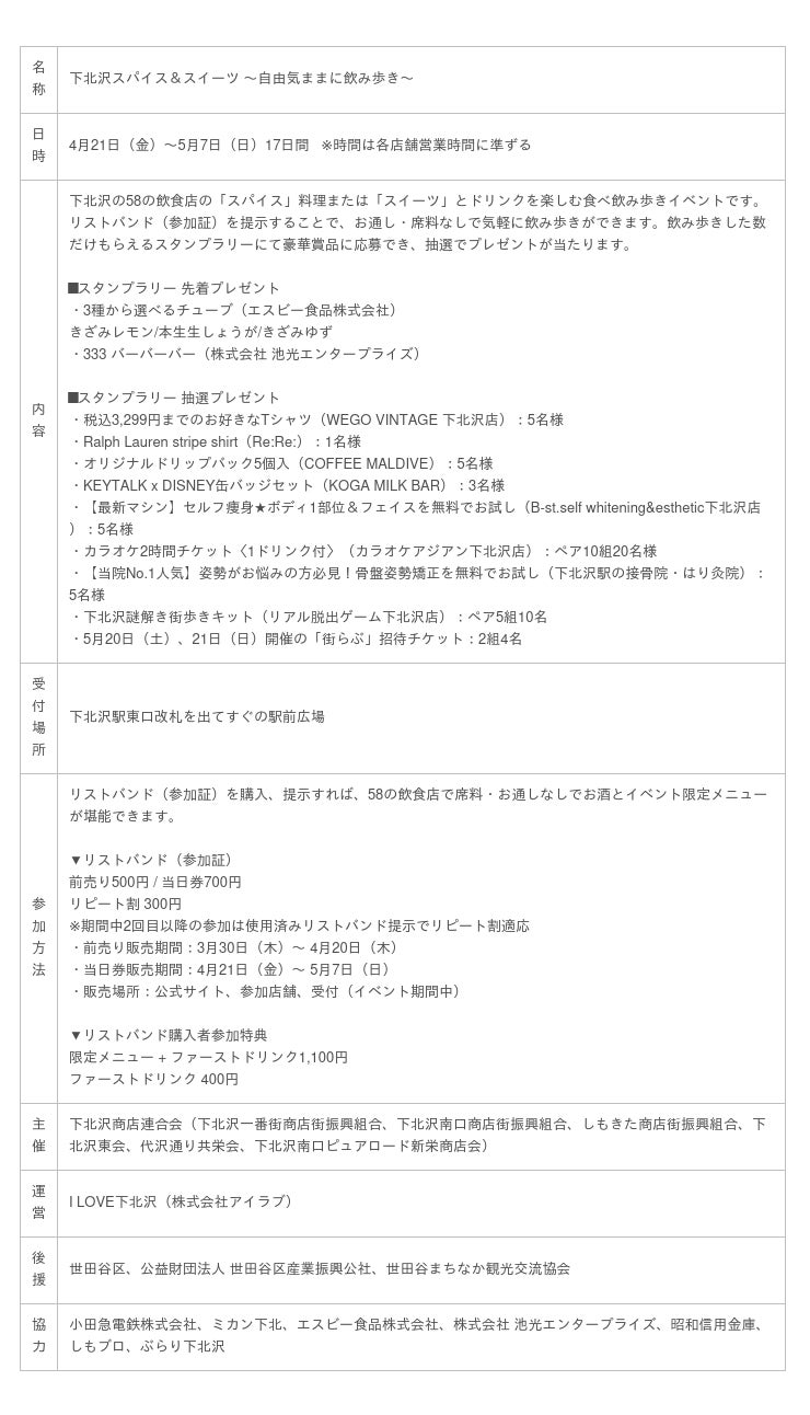 本イベントは、下北沢のディープな飲食店を探訪できる街ぐるみの飲み歩きイベントです。これまでに4万人以上が参加し、15回目を迎える今回は初の試みとなる「スパイス」と「スイーツ」をテーマに開催します。