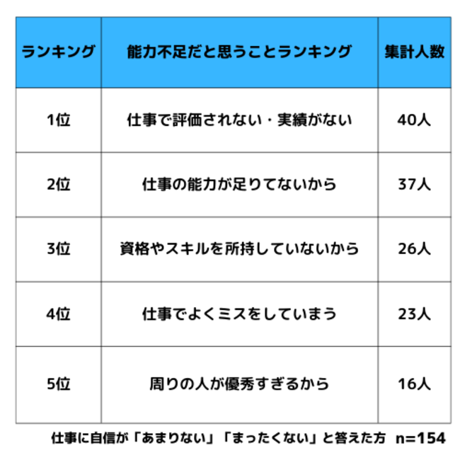 また、仕事に「自信があまりない」「自信がまったくない」と回答をした方に「自信がない理由」をまとめた結果が以下となります。