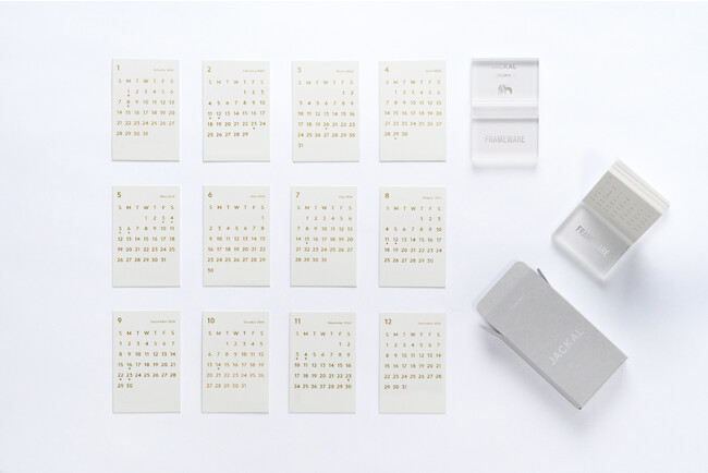 カレンダーカードは厚手の紙に必要な情報のみ表記され、そのサイズながら見やすくスッキリとしたミニマルデザイン。そして情報だけでなくルックスを統一させるため、台座はカレンダーカードのカラーに合わせ、一つひとつ手作業で染めています。天面は鏡面加工、側面はブラスト加工でマットに。光の当たり方によって表情を変え、アクリルなのにガラスの様な深みを作り出しています。JACKALロゴは控え目でありながら深くレーザーにてエングレーブされ、控え目でありながら主張も忘れないデザインは場所を選びません。