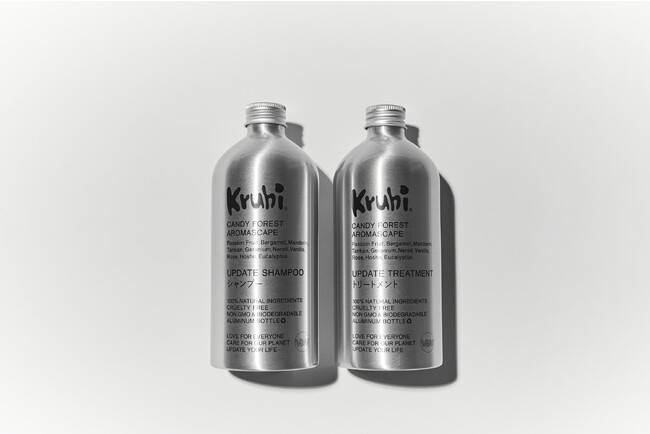 石けんシャンプーとトリートメントの素材については、鹿児島県南大隅町産「農業廃棄物のアップサイクル原料」の使用、自然由来成分100%、石油由来成分等ケミカル不使用。リサイクル効率に優れたアルミ(100%リサイクルアルミ)ボトルを採用し、できる限りプラスチック使用を抑え、原料の全てのトレーサビリティを確保、購入額の1%を環境保護活動団体に寄付するなど、環境循環に配慮。5日間で98.9%生分解されるシャンプー(生分解性確認試験実施済み)や、必ずしも洗い流す必要のないトリートメントなど、可能な限り家庭排水の環境負荷ゼロを目指したアイテムとなっている。