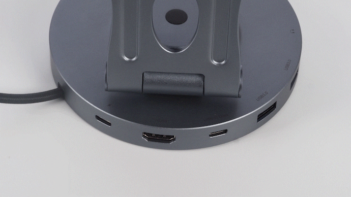 CIRHUB(サーハブ)は、8つのポートが搭載されたハブと、スマホ・タブレットスタンドが一体化した多機能ドッキングステーションです。方向・角度・高度調整可能で、さらに接続用のケーブルが本体に搭載され、別途用意の必要はなく、持ち運びも楽々。