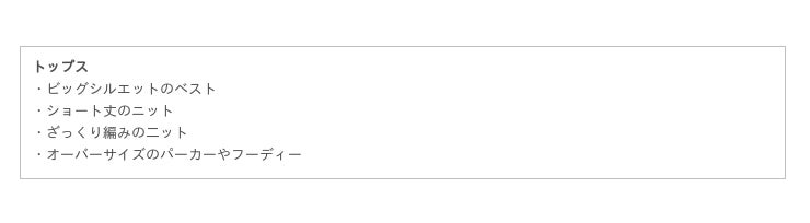 今年はショート丈が流行しそうなので、ニットやコートもショート丈がおすすめ。また、ベストも必須アイテムになりそうな予感なので、1枚持っておくと良いでしょう。
