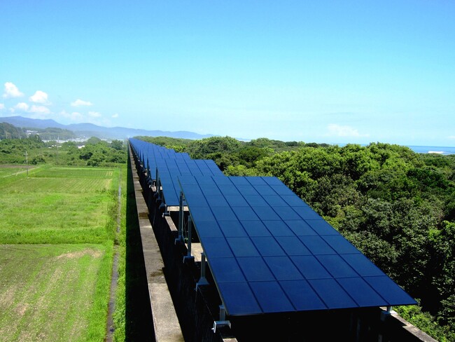 宮崎県都農町の海岸線の近くには、リニアモーターカーの実験線として使われていた長さ3.9kmの高架をメガソーラーに活用した太陽光発電所「宮崎ソーラーウェイ」があります。